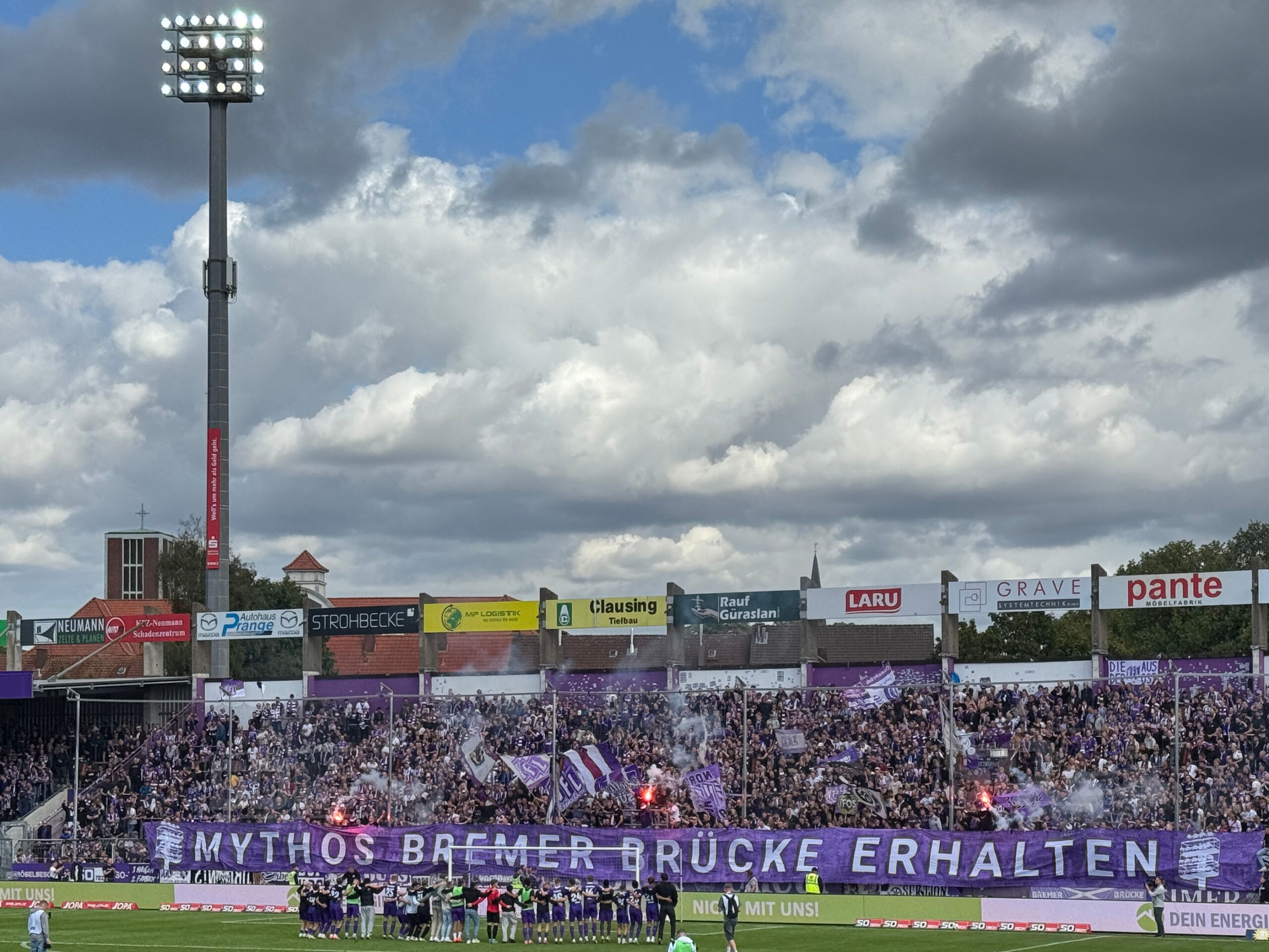 Die Fanszene des Vereins hat uns zum Heimspielbesuch gegen den 1. FC Saarbrücken beeindruckend empfangen und mit einem Banner an der Osttribüne den Planungsauftrag deutlich gemacht: Mythos Bremer Brücke erhalten. Diese Herausforderung nehmen wir an und freuen uns auf die intensive Zusammenarbeit.