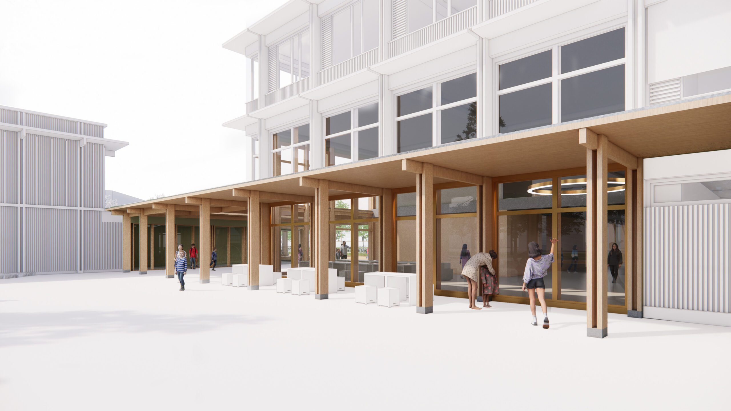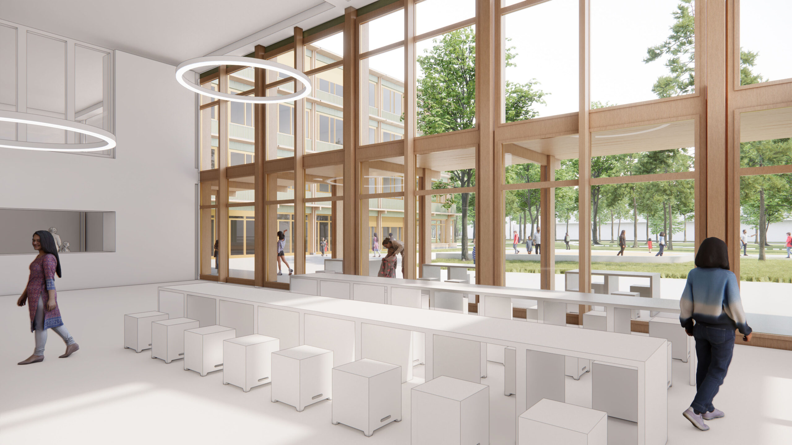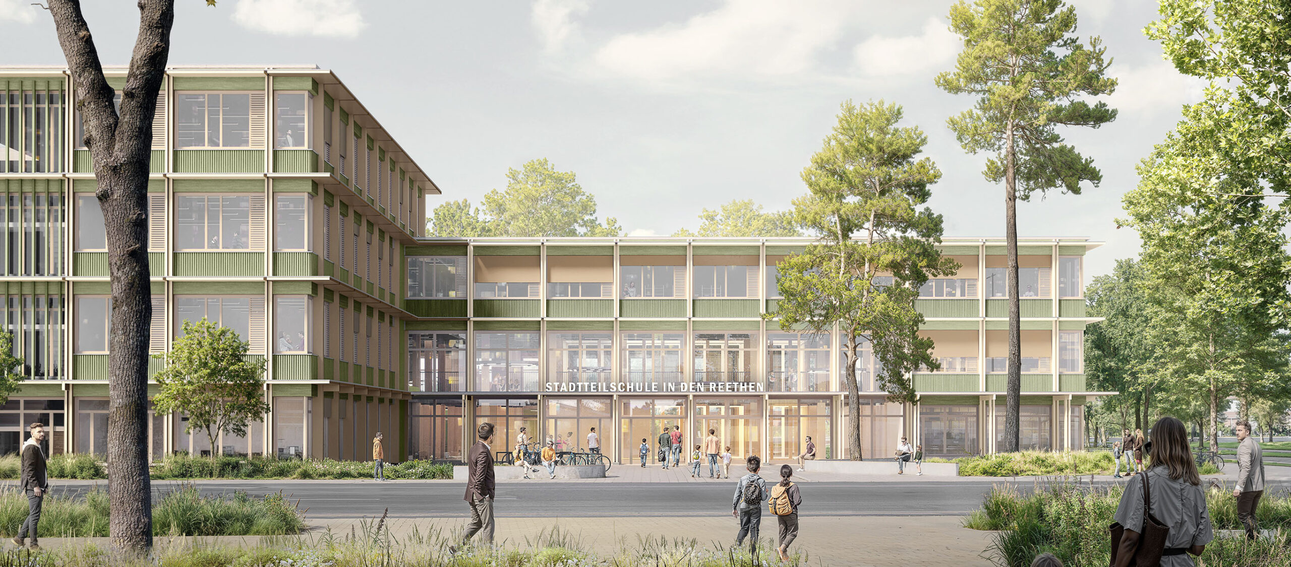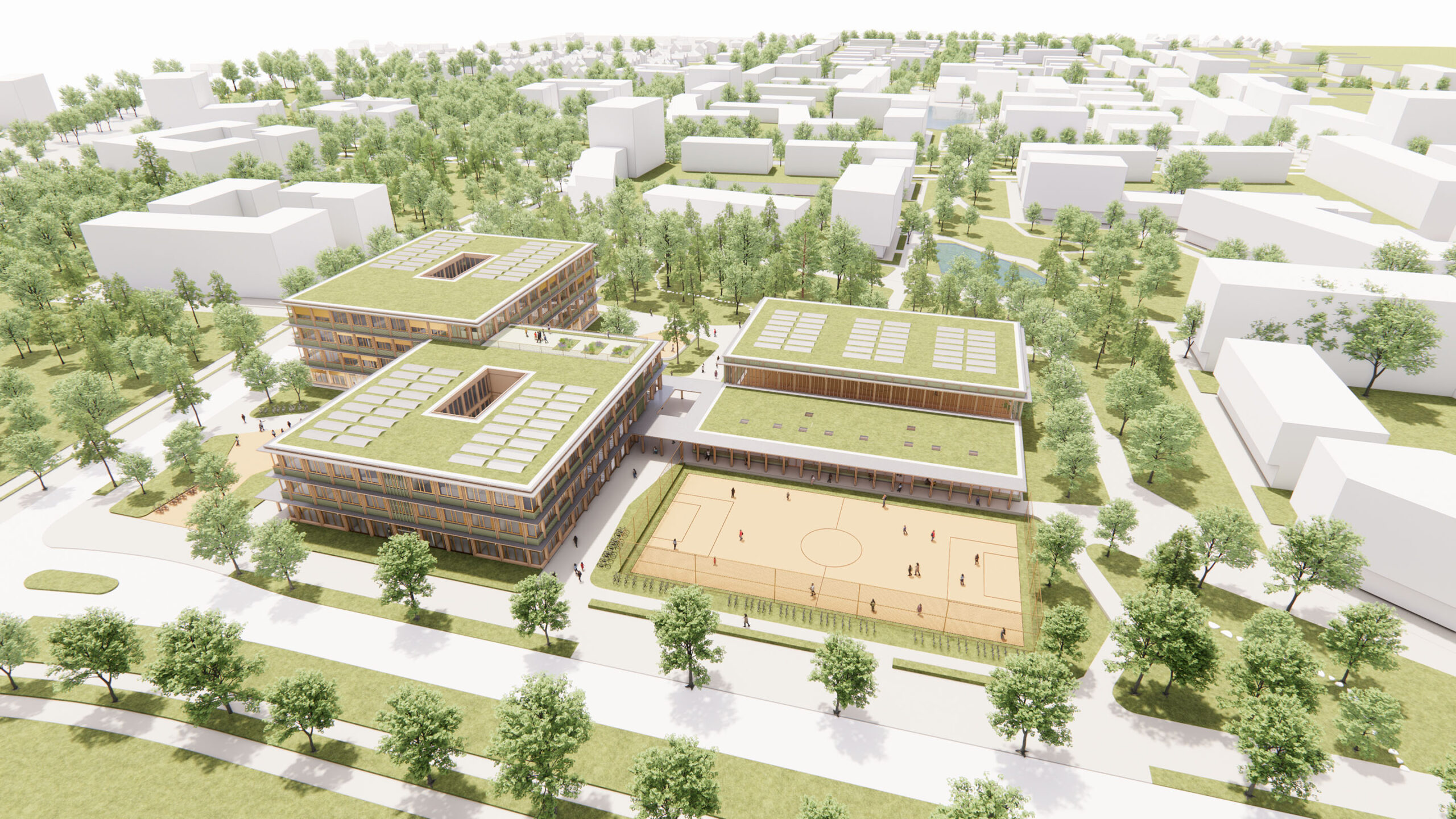 Als Auftakt für das neue Quartier und als sozio-kulturelles Zentrum – mit Stadtteilschule, Volkshochschule und Jugendtreff – kommt dem Neubau eine besondere Rolle zu. Gebäude und Freiraum werden durch eine deutliche Gliederung mit dem vorhandenen Grünzug verwoben: Die beiden versetzt zueinander angeordneten Schulhäuser bieten nicht nur Orientierung, sondern bilden zusammen mit der Dreifeldsporthalle differenzierte Schulhöfe aus. Die Gestaltung der Gebäude wird von der Ästhetik der Holzelementbauweise geprägt, Wirtschaftlichkeit und Flexibilität in der Grundrissgestaltung werden durch die gerasterte Holzhybridkonstruktion gegeben. Ein Low-Tech-Konzept, Dachbegrünungen und Photovoltaik runden die Aspekte der ökologischen Nachhaltigkeit ab.