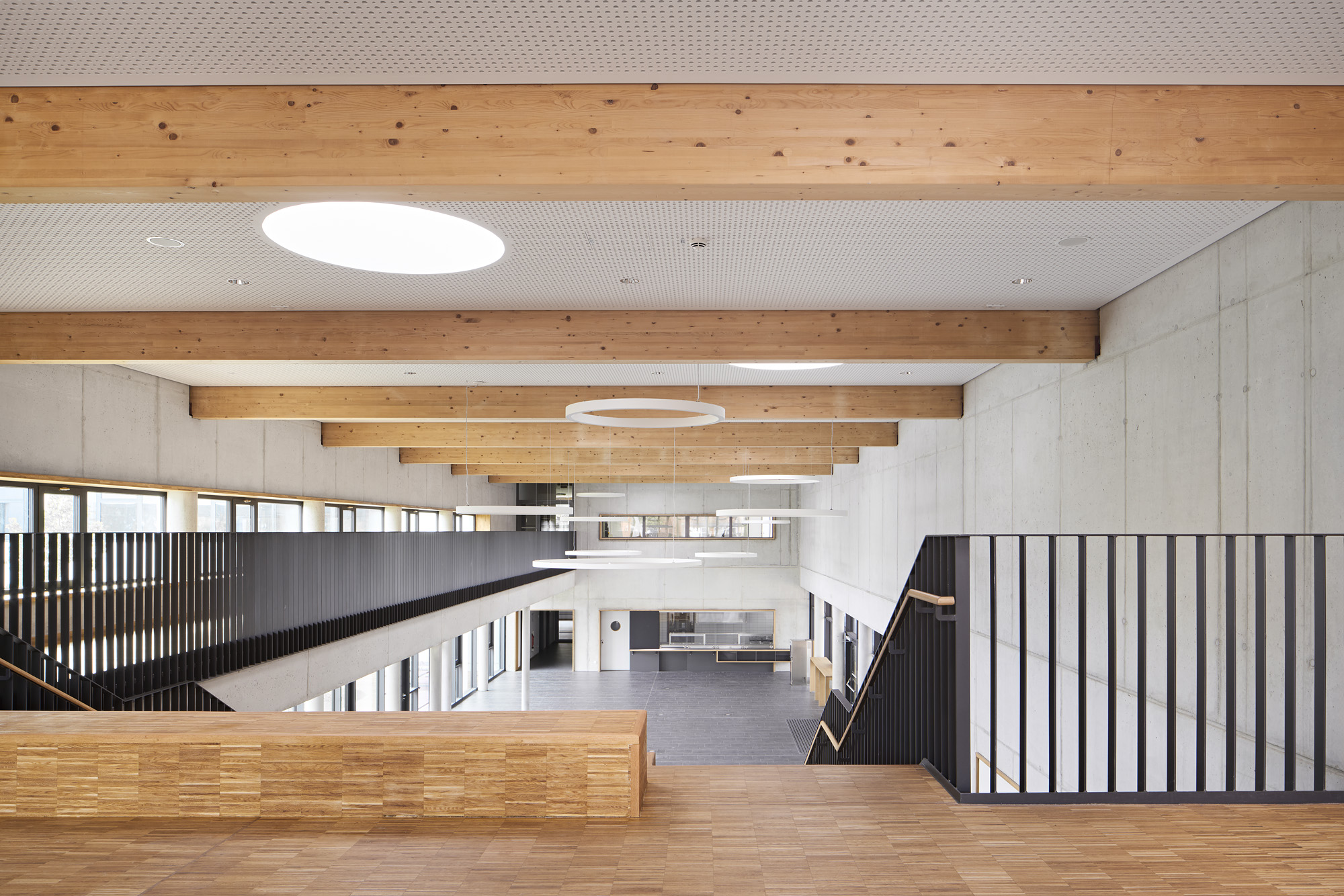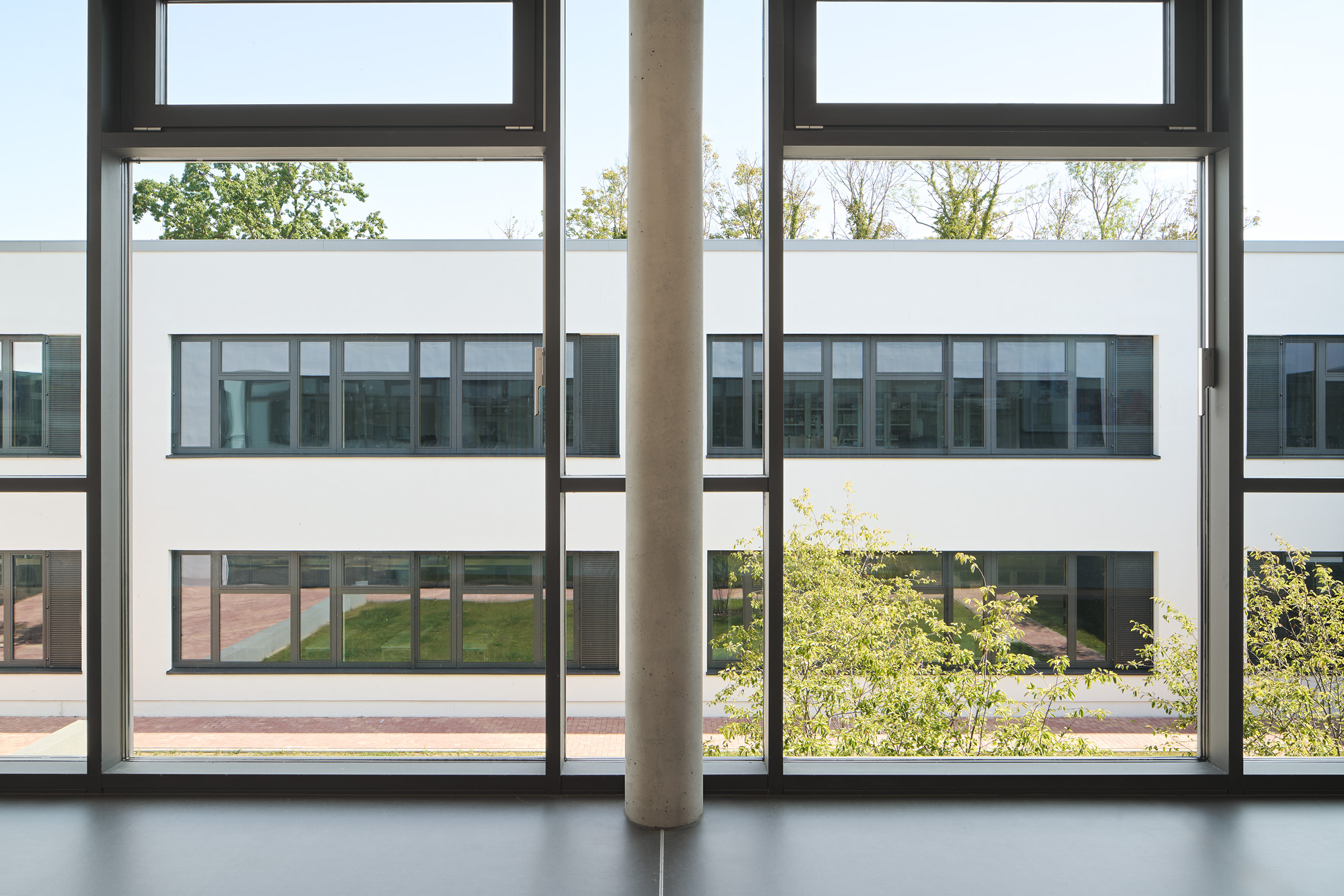 Wo bisher die Schülerinnen und Schüler des Gymnasiums auf dem Sportplatz zu Höchstleistungen angespornt wurden, entstanden drei Neubauten: Ein gemeinsamer Fachklassentrakt, die neu angesiedelte Gemeinschaftsschule und eine Sporthalle am Kopf des Grundstücks. Trotz der räumlichen Zusammenlegung bleibt die Eigenständigkeit beider Schulen durch eine konsequente funktionale Trennung erhalten. Dank lichtdurchfluteter Fach- und Klassenräume und multifunktionaler Erschließungszonen mit individuellem Mobiliar, werden hier nicht mehr ausschließlich sportliche Bestleistungen erbracht, sondern ebenso gestalterische oder mathematische. Es werden nicht nur Schulfeste in der großzügigen Halle der Gemeinschaftsschule stattfinden, sondern auch öffentliche Veranstaltungen der Stadt in der bis zu 1.000 Gäste fassenden Sporthalle. Das gesamte städtische Umfeld – vom Stadtpark bis zum Tennisplatz – erhält durch den Schulcampus neue Impulse!