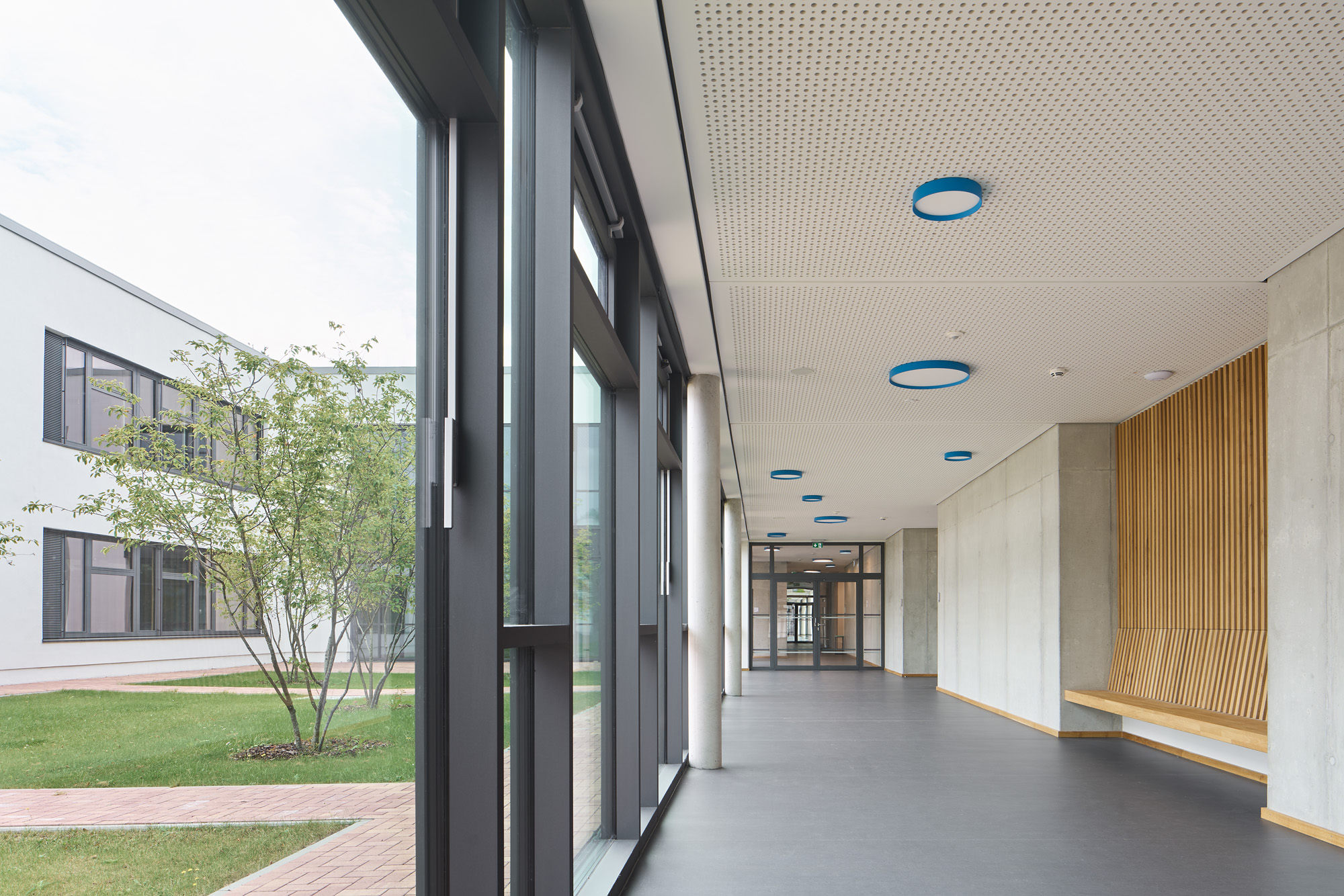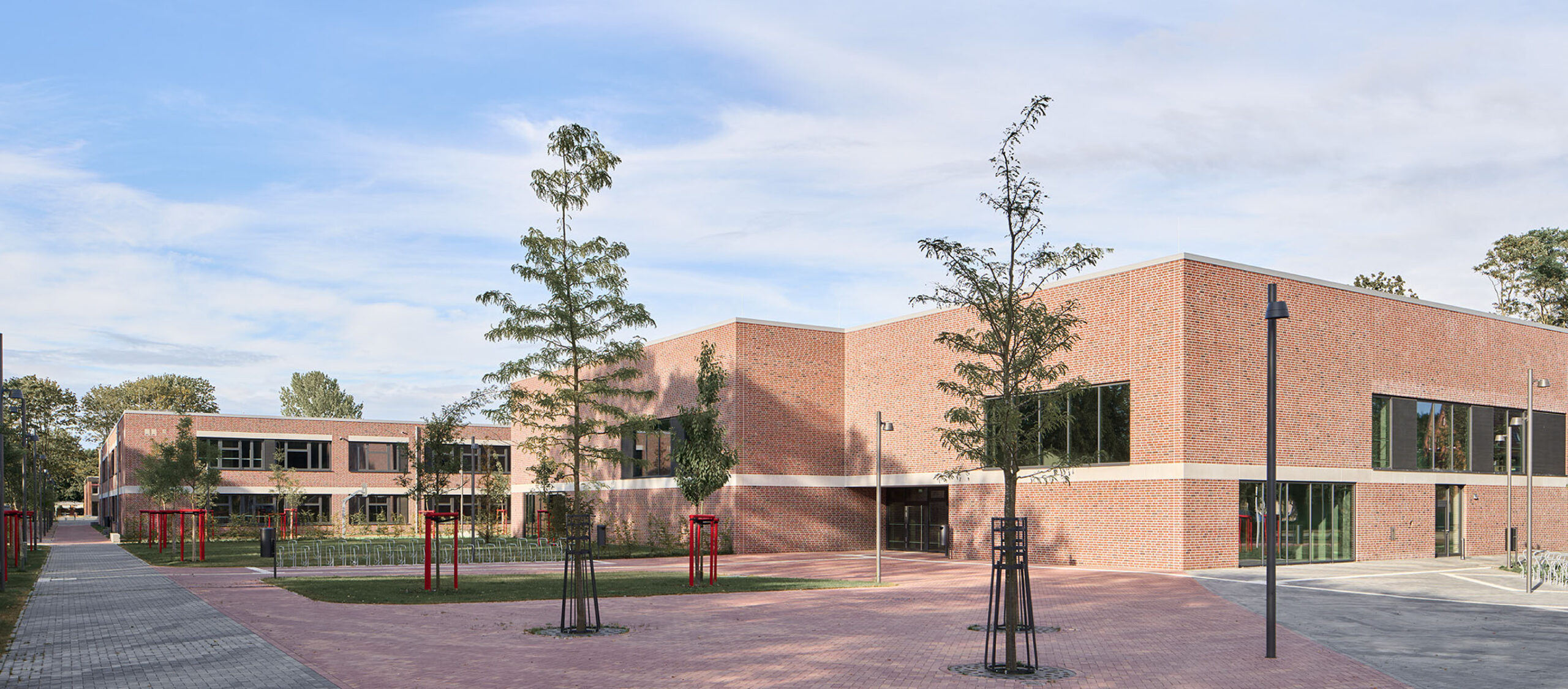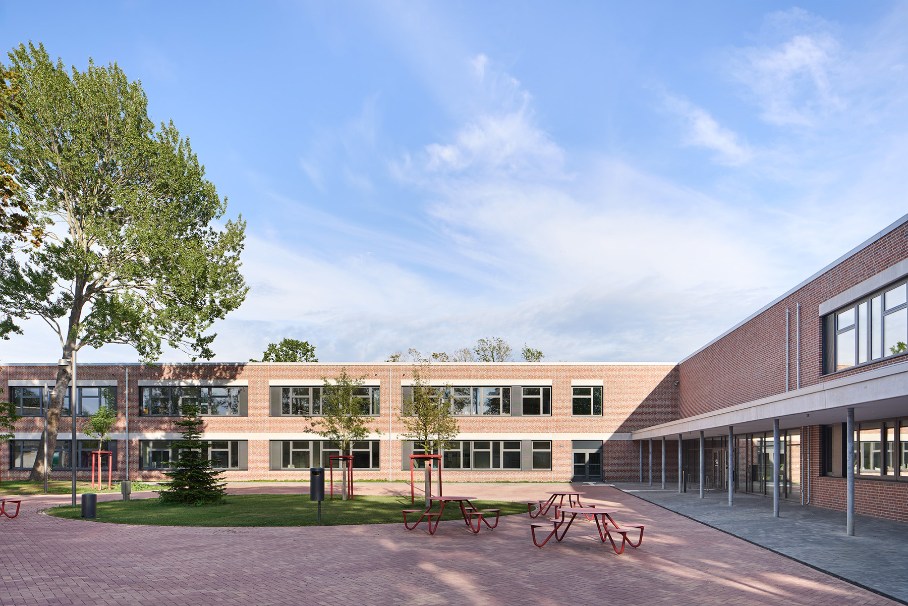 Aufgereiht wie an einer bewegten Perlenkette folgen die Neubauten für das Gymnasium und die Gemeinschaftsschule in Oldenburg der Typologie des aus den 1960er Jahre stammenden Hauptgebäudes: Zweigeschossige rote Klinkerbauten, die ihren Charakter durch großzügige Innenhöfe erhalten und durch offene, klare Grundrisse überzeugen.