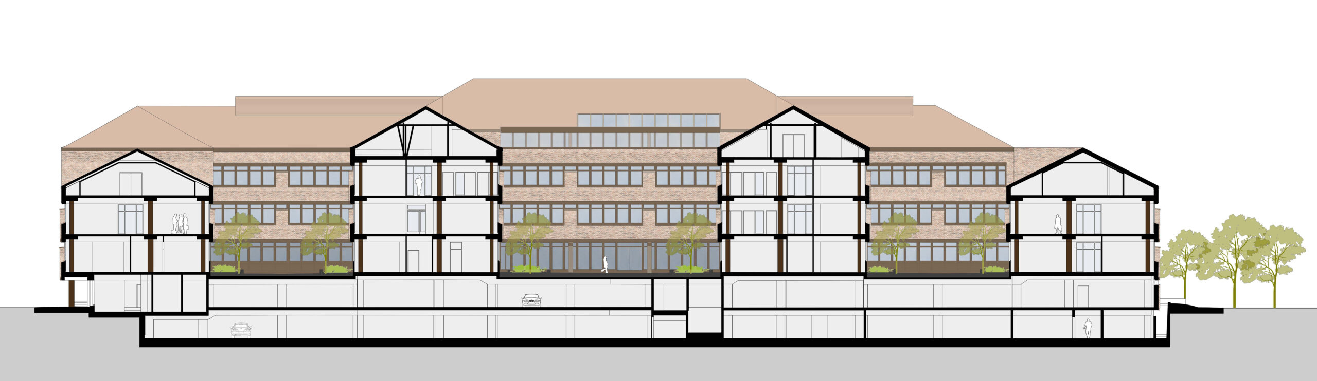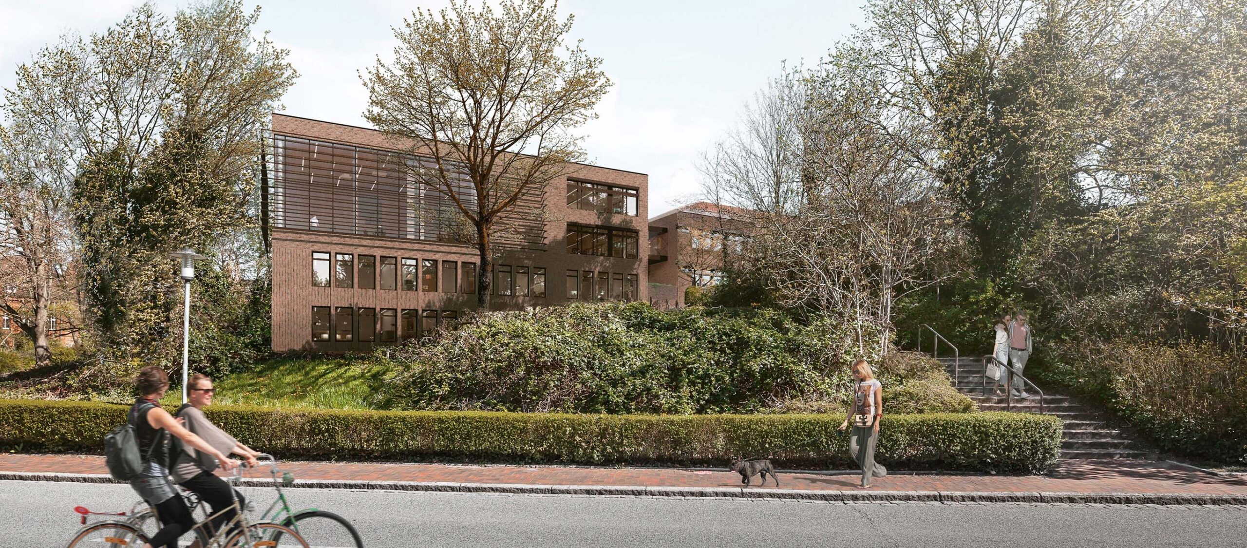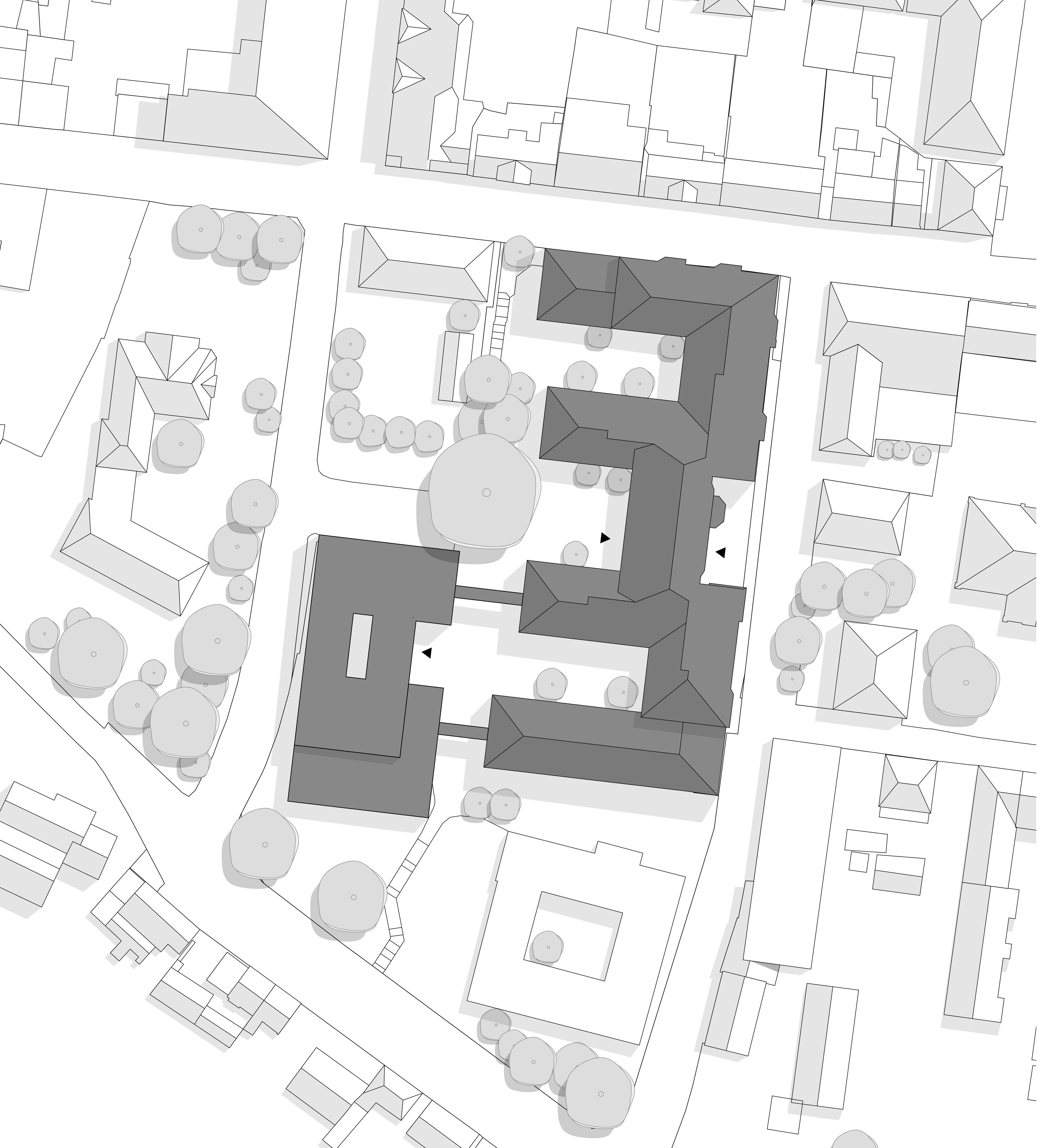 Der denkmalgeschützte Bestandsbau des Kreishauses aus den 1970er Jahren fügt sich durch die Gliederung in Vorder- und Hofhäuser, die Ziegelfassaden und geneigten Dächer in die Strukturen der Ratzeburger Altstadtinsel ein. Wir haben dieses Konzept mit dem Erweiterungsbau, der die Flächen fast verdoppelt, weitergesponnen. Der kompakte Solitär, der sich hangseitig an der Rückseite anschließt, nimmt Maß und Material über fünf Geschosse auf und passt sie im Detail subtil an. Ein lichtdurchflutetes Atrium, kommunikative Büros und ein von Holzoberflächen geprägter Kreistagssaal – mit Blick über den Küchensee – schaffen beste Arbeitsbedingungen.