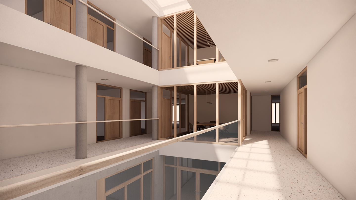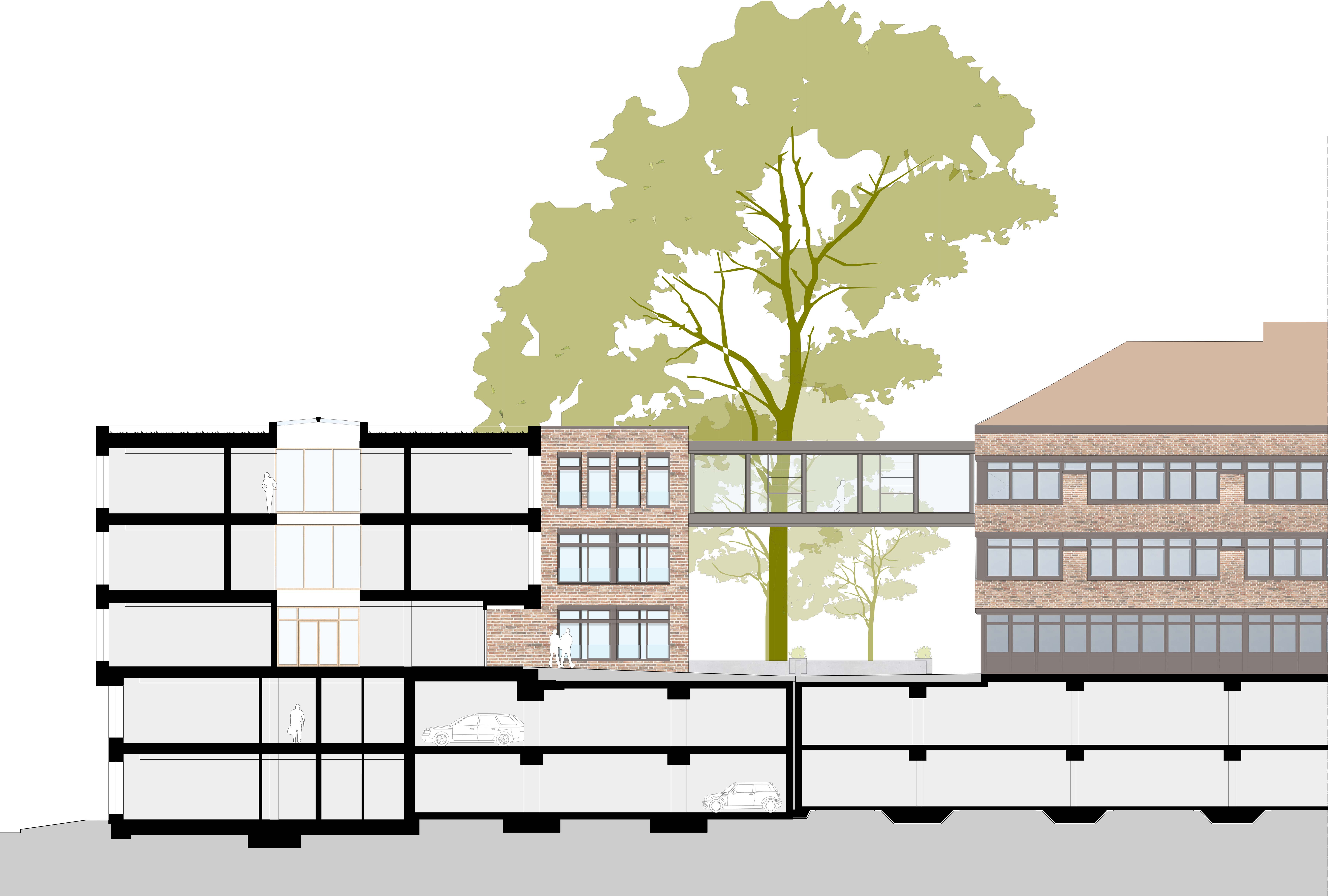 Der Bestandsbau bleibt äußerlich unangetastet, erfährt im Inneren jedoch eine Wandlung: Anstatt vieler kleiner Büros durchzieht das Gebäude eine abwechslungsreiche Bürolandschaft. Eine zweigeschossige Tiefgarage verbindet beide Bauten.