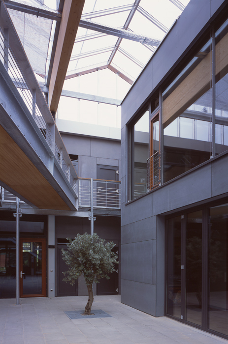Das Gebäude der „seed- und start up Stadt“ wurde als Ensemble unterschiedlicher Häuser mit verschiedenen Aufgaben entwickelt. Den Mittelpunkt bildet die zwischen den Büroriegeln und Serviceboxen entstehende Glashalle als überdachter „Marktplatz“, über die das gesamte Gebäude erschlossen wird. Diese zentrale Halle steht für gemeinschaftliche Nutzungen, wie z.B. Ausstellungen, Feste, Veranstaltungen und als „Straßencafé“ zur Verfügung. Sie ist zentraler Treffpunkt für alle Nutzer, Kunden und Gäste. Im Rahmen des Low-Tech-Energiekonzeptes kommt der Halle eine herausragende Bedeutung als unbeheizter Klimapufferraum zwischen den Büros und dem Außenraum zu. Olivenbäume und Brunnenplatine unterstreichen den Platz- und Außenraumcharakter der Halle. Das Gebäude bietet flexibel unterteilbare Büroeinheiten in Größen von 45-800 qm.